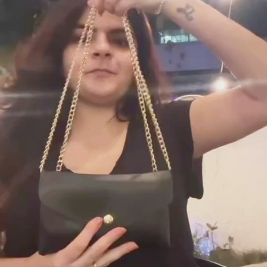Sleek and lightweight, this Black Envelope Bag with a gold chain detail is perfect for elevating everyday and evening looks.